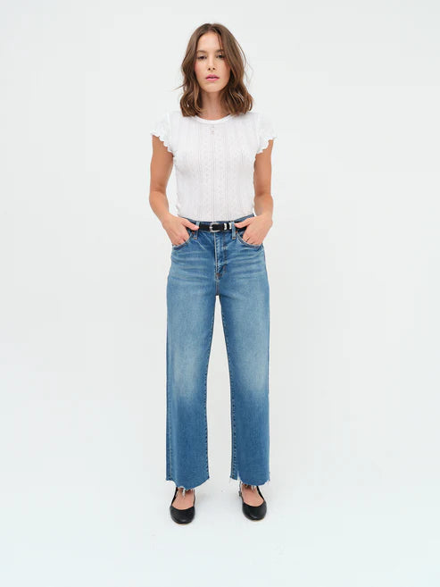 The Pleaser is our tried and true high rise wide ankle, featuring seaming details at the waist against an indigo blue wash with slight fading. Constructed from our Hug denim, it’s flexible enough to hug your body while still cinching you in.
