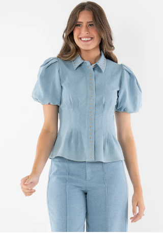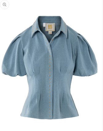 The Britt Top redefines denim with a feminine edge. Featuring a classic fold collar, puff sleeves with elastic cuffs, and a lightly boned bodice, this style offers both structure and ease. A concealed front button closure is framed by a gold-studded panel, adding a subtle western-inspired detail. Crafted in stretch denim, it flatters the figure while providing comfort, making it as timeless as it is on trend. Pair with the matching Paisley Pant for a full denim look that’s effortlessly chic and designed to turn heads.