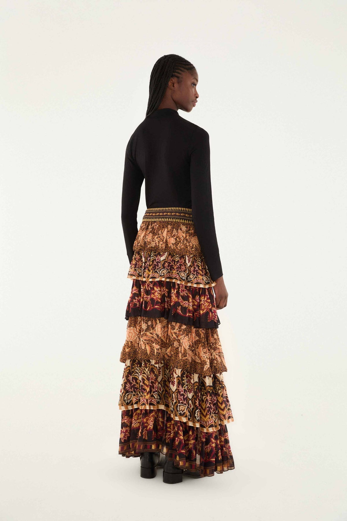 Celebrate bold elegance with the Mixed Scarves Ruffled Maxi Skirt by FARM Rio. This enchanting piece features tiered layers of vibrant, vintage-inspired prints that cascade in playful ruffles. Earthy tones blend with soft blues and warm browns, creating a tapestry of intricate florals and baroque motifs. The flowing silhouette embraces a graceful movement, perfectly capturing the brand’s signature joyful and artistic spirit. Ideal for moments where beauty meets comfort.