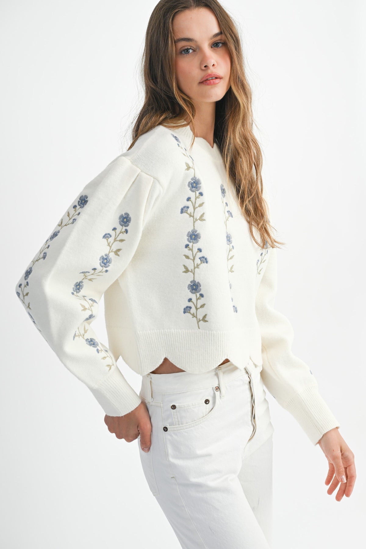 Long sleeve floral embroidery detail scalloped hem and neckline sweater knit top.