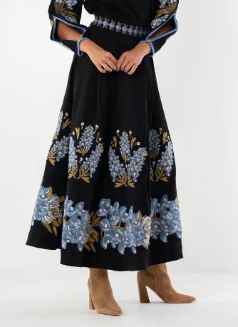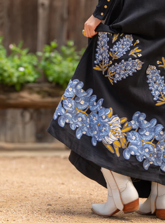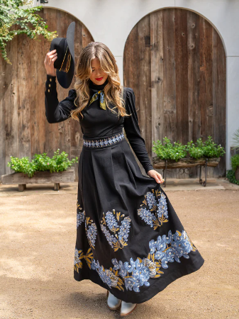 The Milly Skirt is a true statement piece from this collection, designed to celebrate the beauty and heritage of the state. Crafted in a structured, denim-like fabric, it showcases an embroidered placed print of Texas’ iconic bluebonnet flower. A figure-hugging high waistband flows into a voluminous maxi silhouette, creating graceful movement with every step. Finished in the back with an exposed gold zipper, the Milly balances modern refinement with western charm. Pair it with the coordinating Graham Top for a head-to-toe look that captures both elegance and Texan spirit.