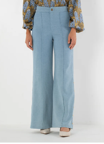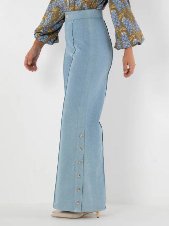 The Paisley Pant in Denim is a high-waisted statement style designed with a flattering wide-leg silhouette. Crafted in stretch denim for comfort and movement, it elongates the figure while offering a slimming fit. A side slit adorned with gold stud snaps adds both function and flair—allowing ease of movement and shoe exposure with every step. Front pleats and pressed seams add tailored polish, while our signature gold button closure gives a refined finish. Both modern and versatile, this pant pairs effortlessly with the matching Britt Top for a head-to-toe denim look or styles back to everyday separates for endless wearability.