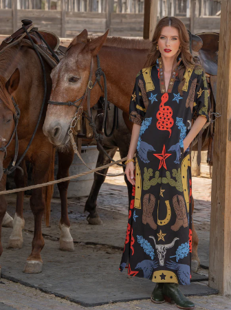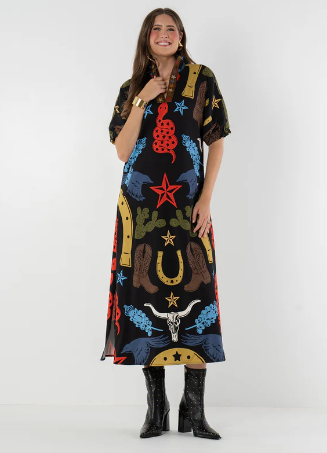 The Poppy Maxi in Lone Star is a bold ode to Texas style, featuring a classic stand collar, loose elastic dolman sleeves, and an effortless, relaxed silhouette that flows into a maxi-length hem. Designed with side slits for ease of movement and subtle allure, this style also includes practical front slit pockets. The Lone Star print captures the spirit of the West with iconic Texan symbols layered in vibrant color for a striking effect. Finished with a curved shirt-tail hem, this maxi brings a touch of western edge while staying true to feminine, easy elegance.