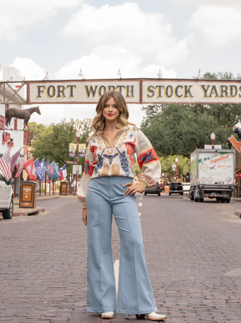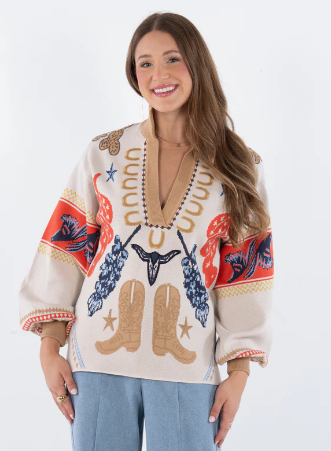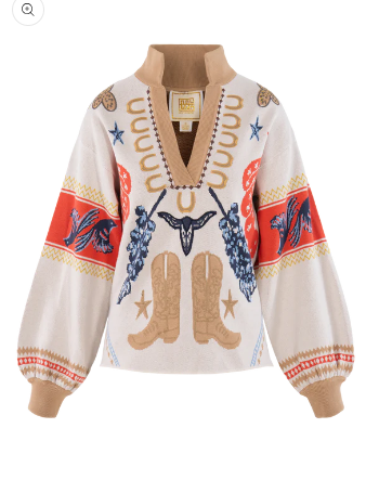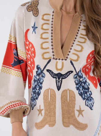 The Poppy Maxi in Lone Star is a bold ode to Texas style, featuring a classic stand collar, loose elastic dolman sleeves, and an effortless, relaxed silhouette that flows into a maxi-length hem. Designed with side slits for ease of movement and subtle allure, this style also includes practical front slit pockets. The Lone Star print captures the spirit of the West with iconic Texan symbols layered in vibrant color for a striking effect. Finished with a curved shirt-tail hem, this maxi brings a touch of western edge while staying true to feminine, easy elegance.