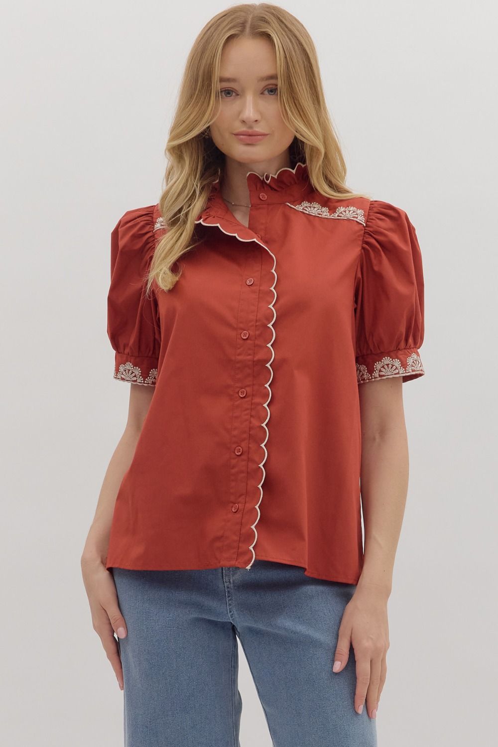 Floral print short puff sleeve top featuring V-neckline and frill-accented mock neck. Multicolor contrast banding at sleeve hem. Unlined. Non-sheer. Woven. Lightweight.