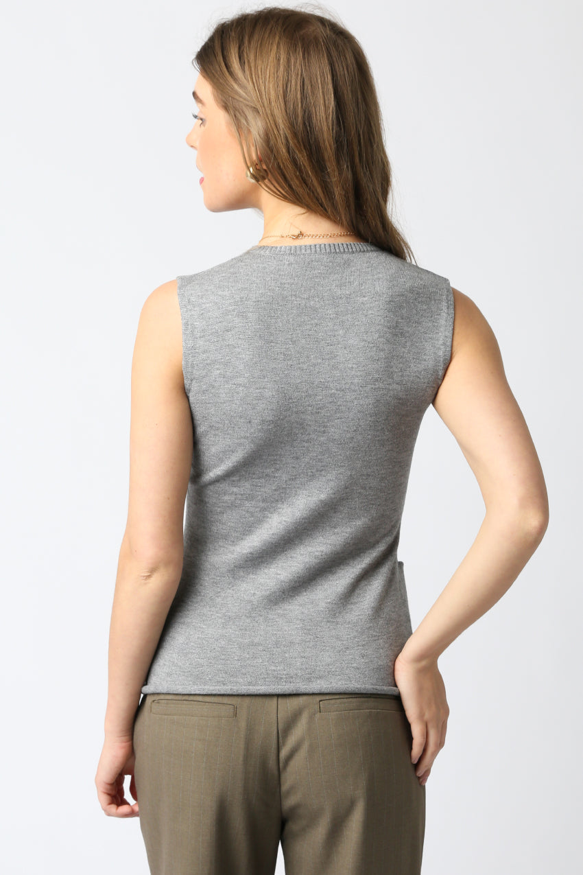 Modern and minimal, this sleeveless grey knit vest features a button-down front and tailored fit that flatters and layers with ease. Style it solo with trousers or pair it over a blouse for a polished boutique look that transitions effortlessly from work to weekend.