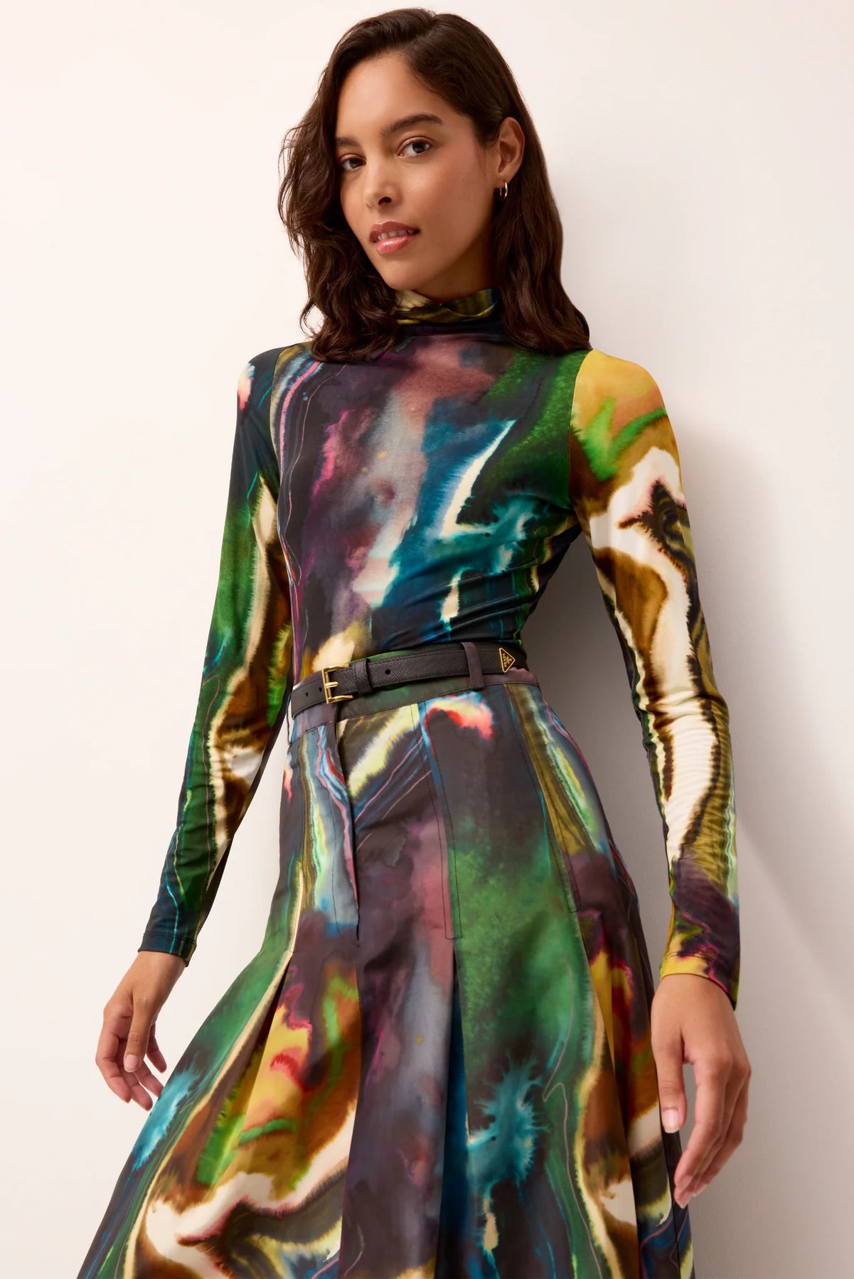 Cut from a sumptuous jersey knit, Marie Oliver’s figure-skimming Eloise top returns in bloom, our fall floral of subdued bright petals across a green lawn. Complement it with the sweet silhouette of our Crawford skirt in Juniper Green for a cohesive look that will take you from the executive suite to brunch outfit goals.