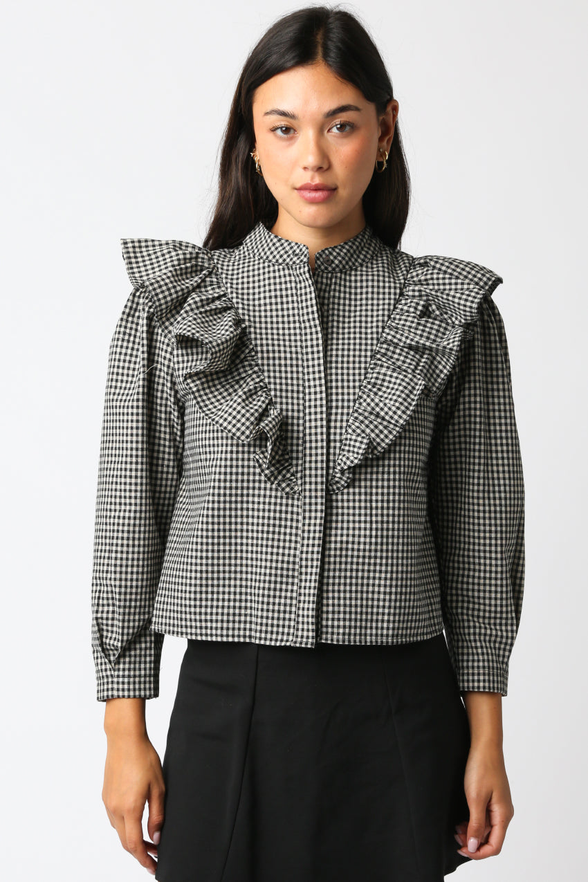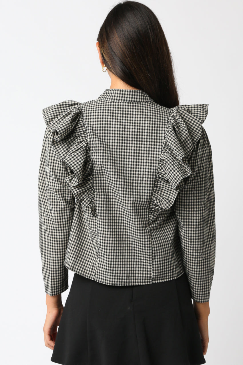 Make a statement in this gingham blouse with bold ruffle detailing along the shoulders and chest. The structured silhouette, stand collar, and tailored sleeves give this top a modern twist on a timeless print. Perfect for the office, dinner, or weekend outings, this versatile piece adds effortless sophistication to any wardrobe.