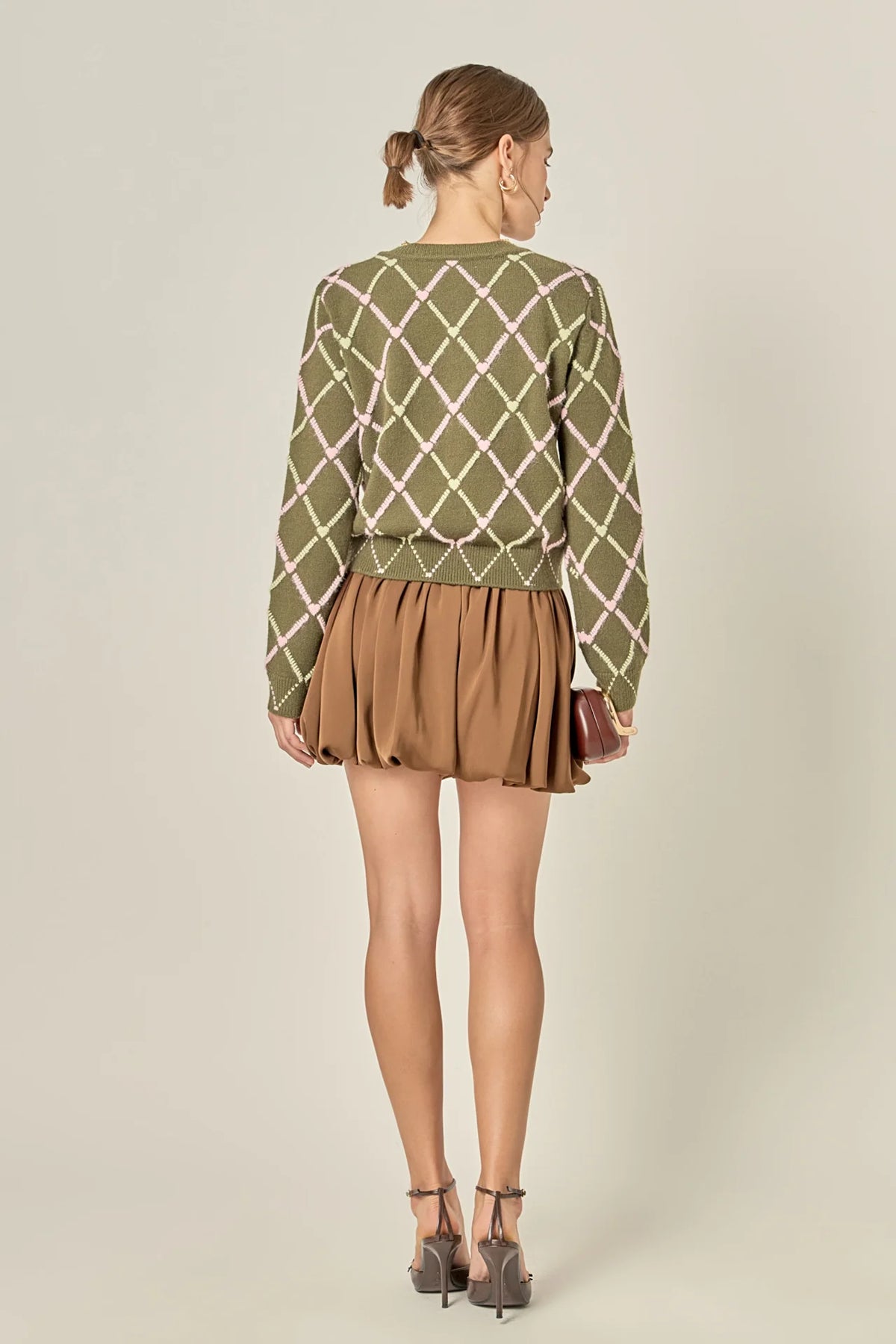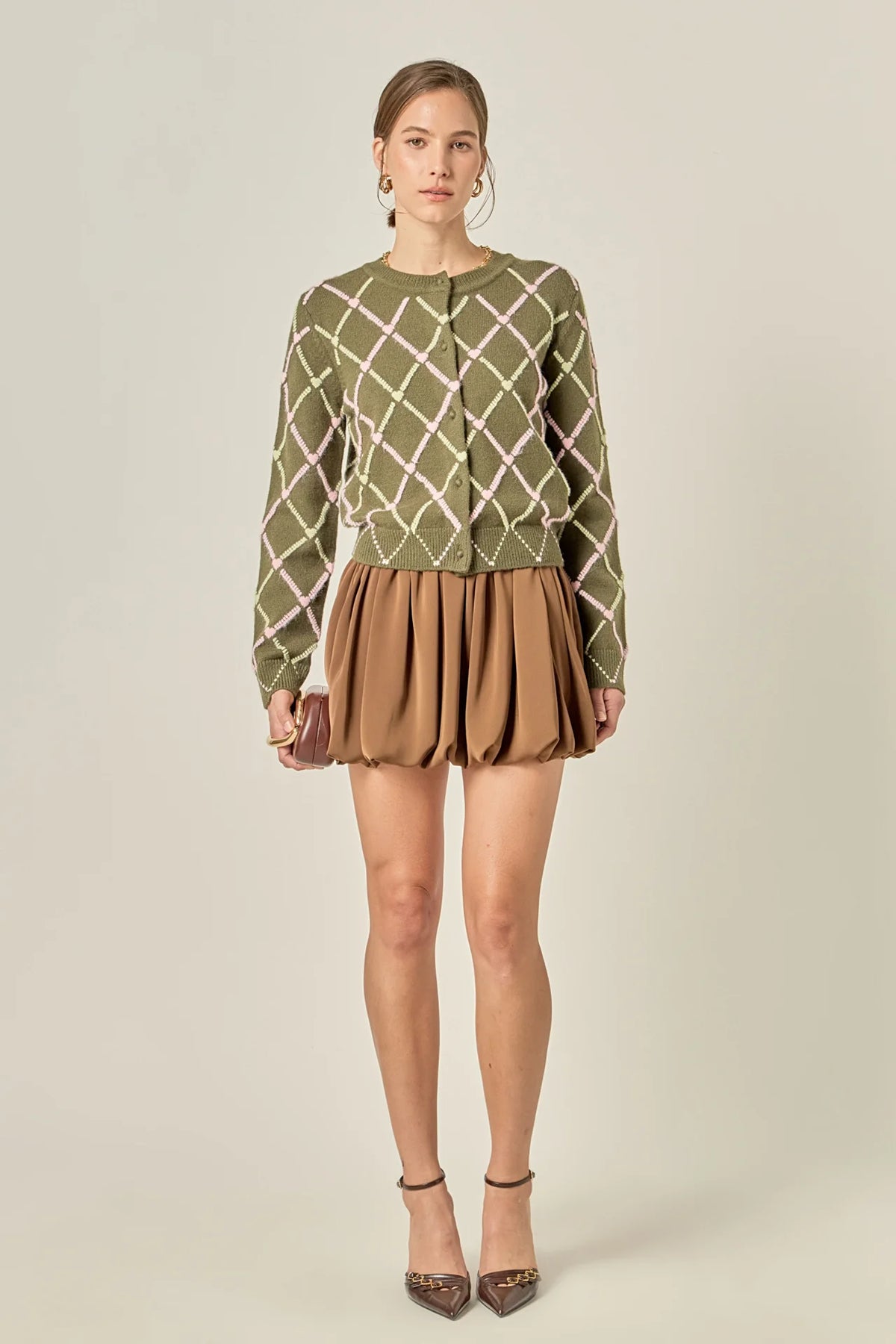 A cozy layer with a romantic twist. This knit cardigan features an all-over diamond motif trimmed with delicate heart details, blending playful charm with polished style. Finished with a clean round neckline and tonal button front, it offers endless styling versatility. Pair it with denim for day or a pleated mini for a softer, feminine look. A standout piece for seasons of layering.