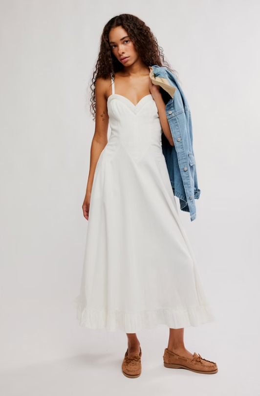 Flirty and femme, this playful midi dress features a breathable denim fabrication, a classic A-line silhouette, and a sweetheart neckline for a timeless touch.