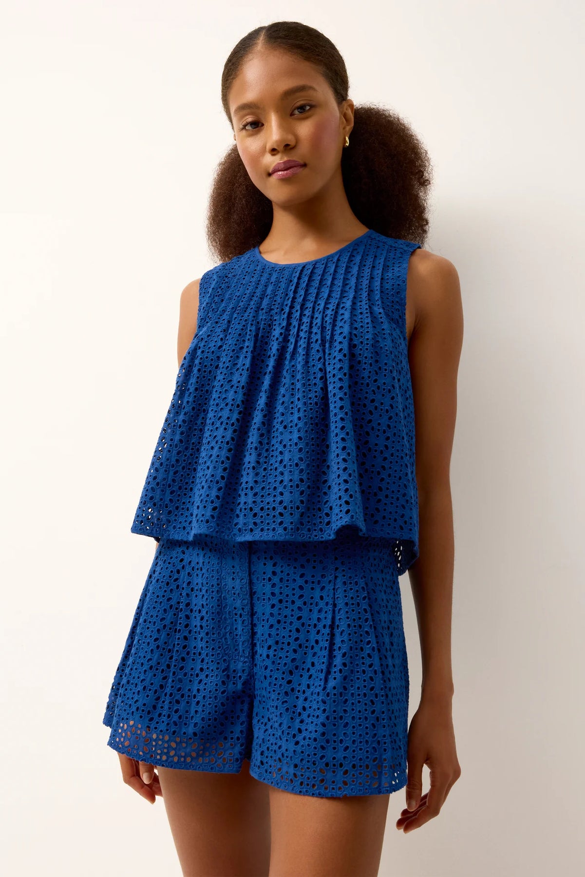 A design team favorite, Eletta is an easy swing top with pretty pintuck pleats and a flattering A-line shape. It comes in our new Admiral eyelet, a deep, saturated blue. Pair it with the matching Lander short or Teresa skirt for a relaxed take on seaside-worthy sophistication.