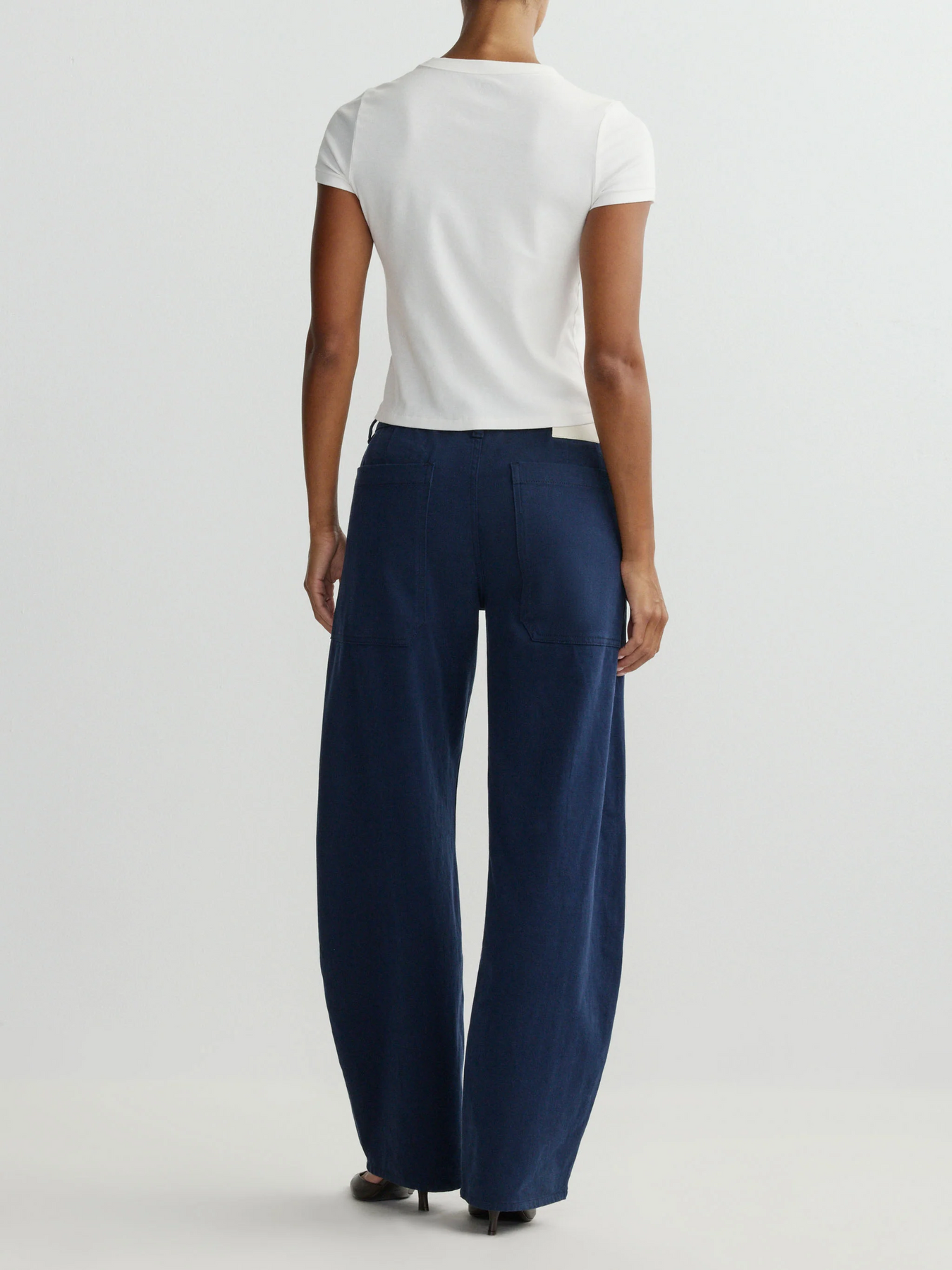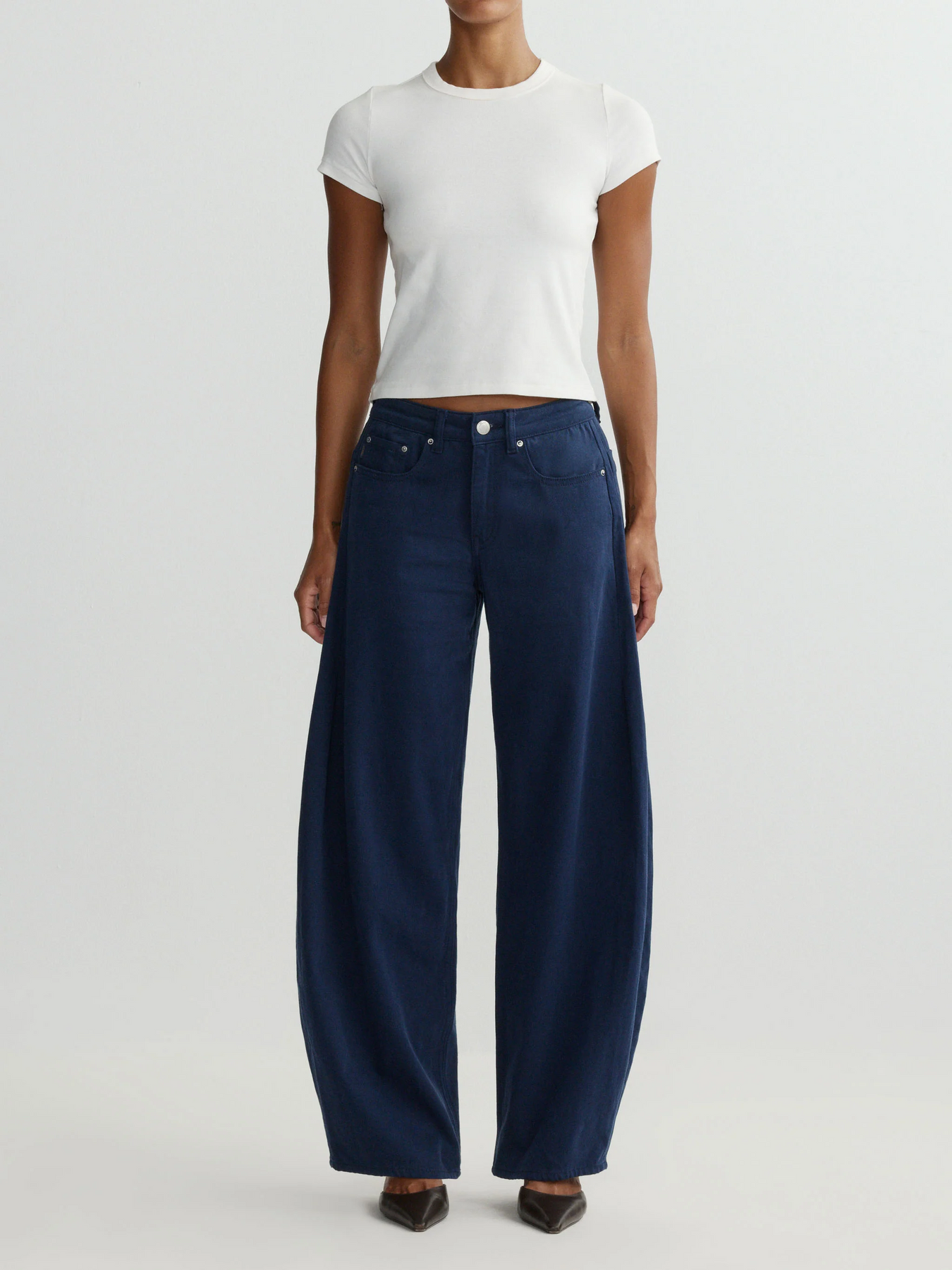 Rori Horseshoe is a wide barrel leg designed with an exaggerated silhouette for a bold, sculptural look.