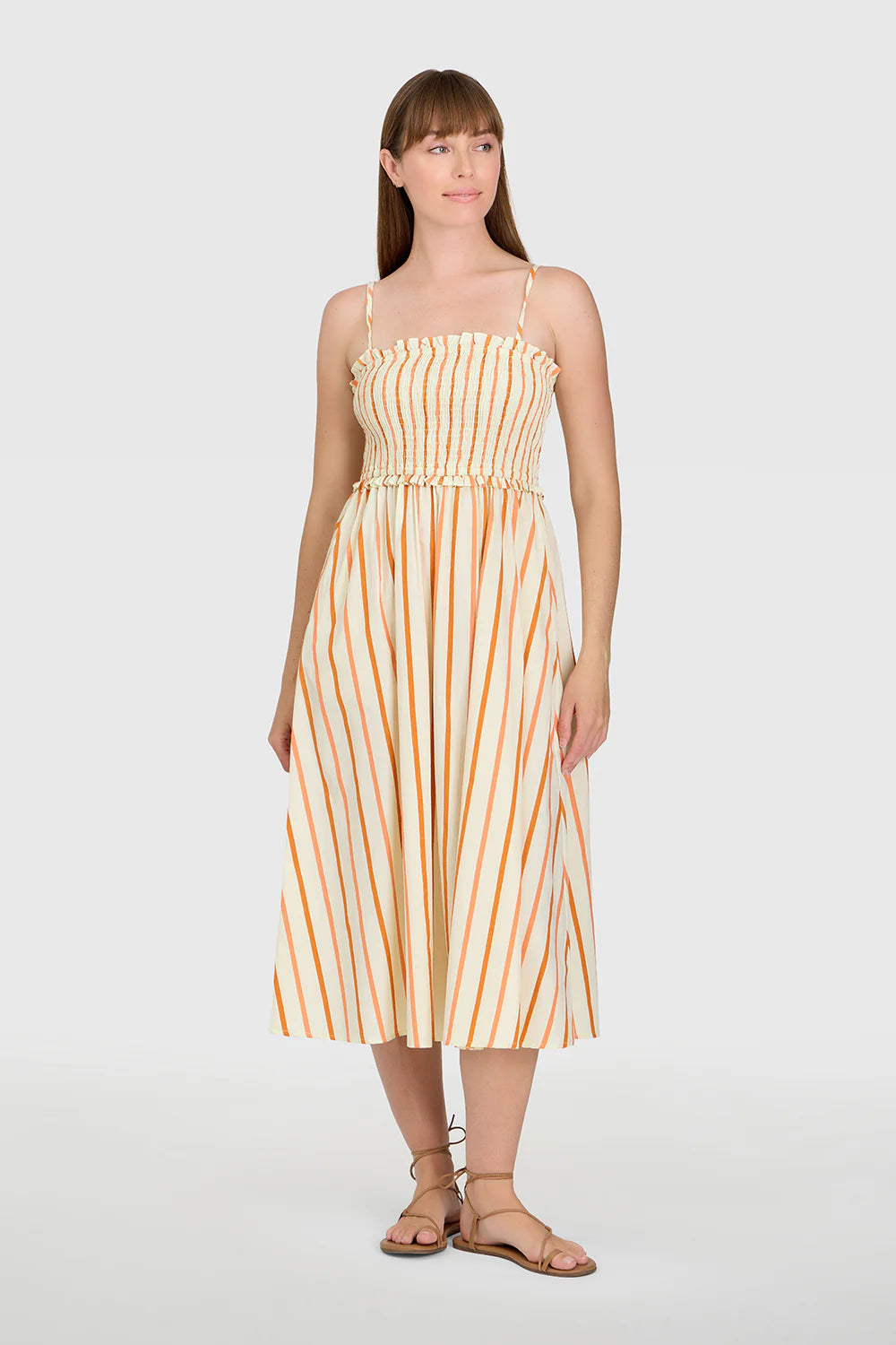 The Smocked Dress features a breezy, feminine silhouette with a smocked bodice and flowy A-line skirt. Designed with delicate, adjustable spaghetti straps, it offers a flattering, form-fitting top that gives way to a relaxed, mid-length skirt. The structured smocking enhances comfort and shape, while the lightweight fabric allows for effortless movement. It's the perfect warm-weather staple—easy to wear, packable for travel, and chic from day to night.